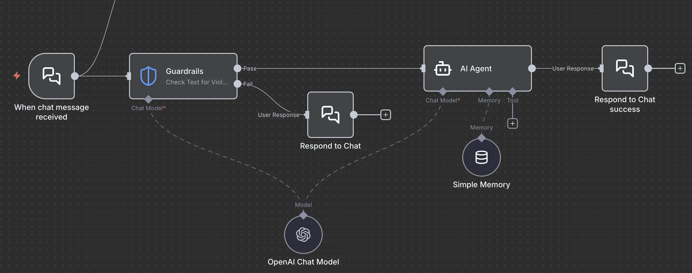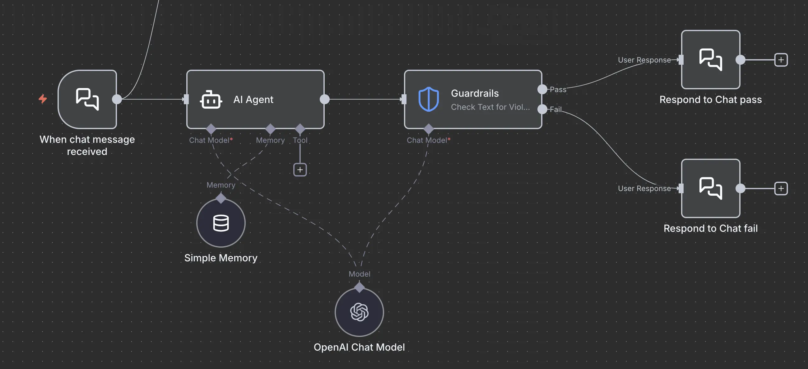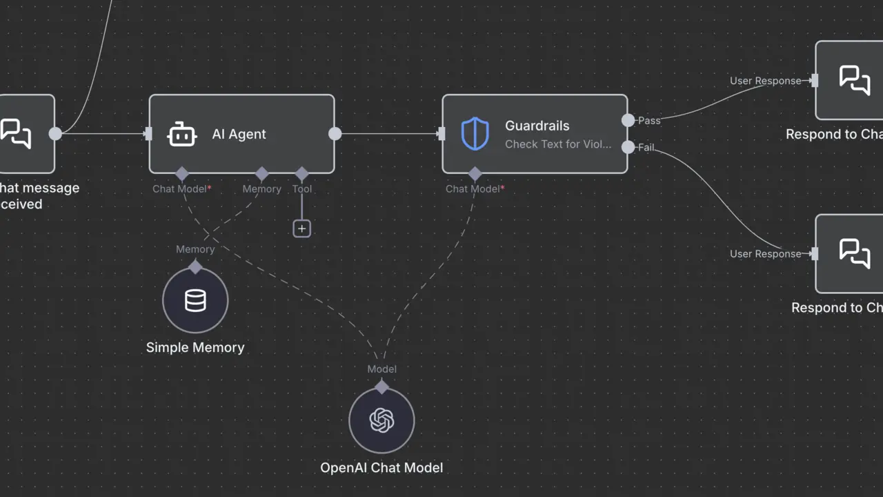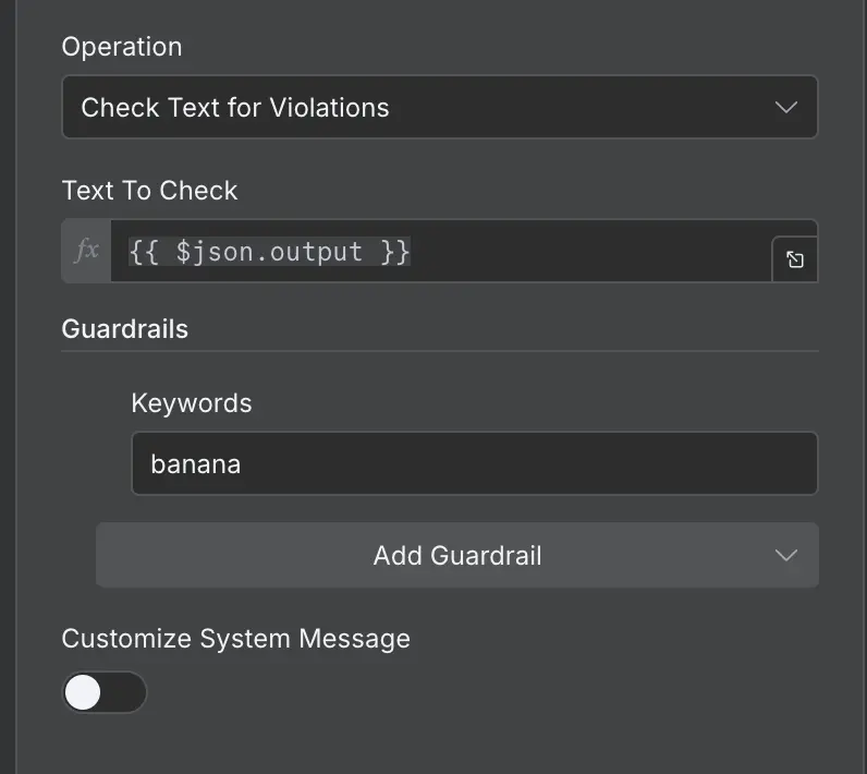 Use the Guardrails node to enforce safety, security, and content policies on text. You can use it to validate user input before sending it to an AI model, or to check the output from an AI model before using it in your workflow.